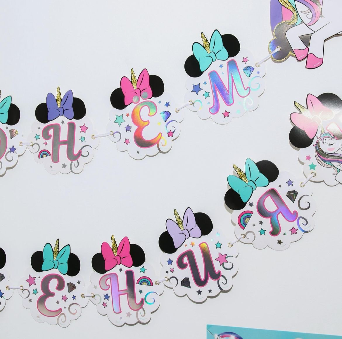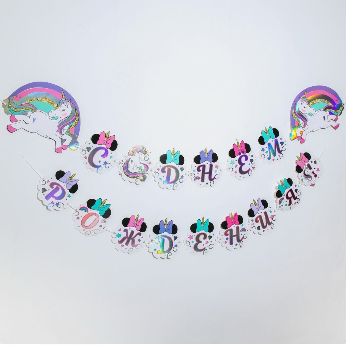 Гирлянда с голографией "С Днем Рождения!", длина 160 см, Минни Маус и Единорог.