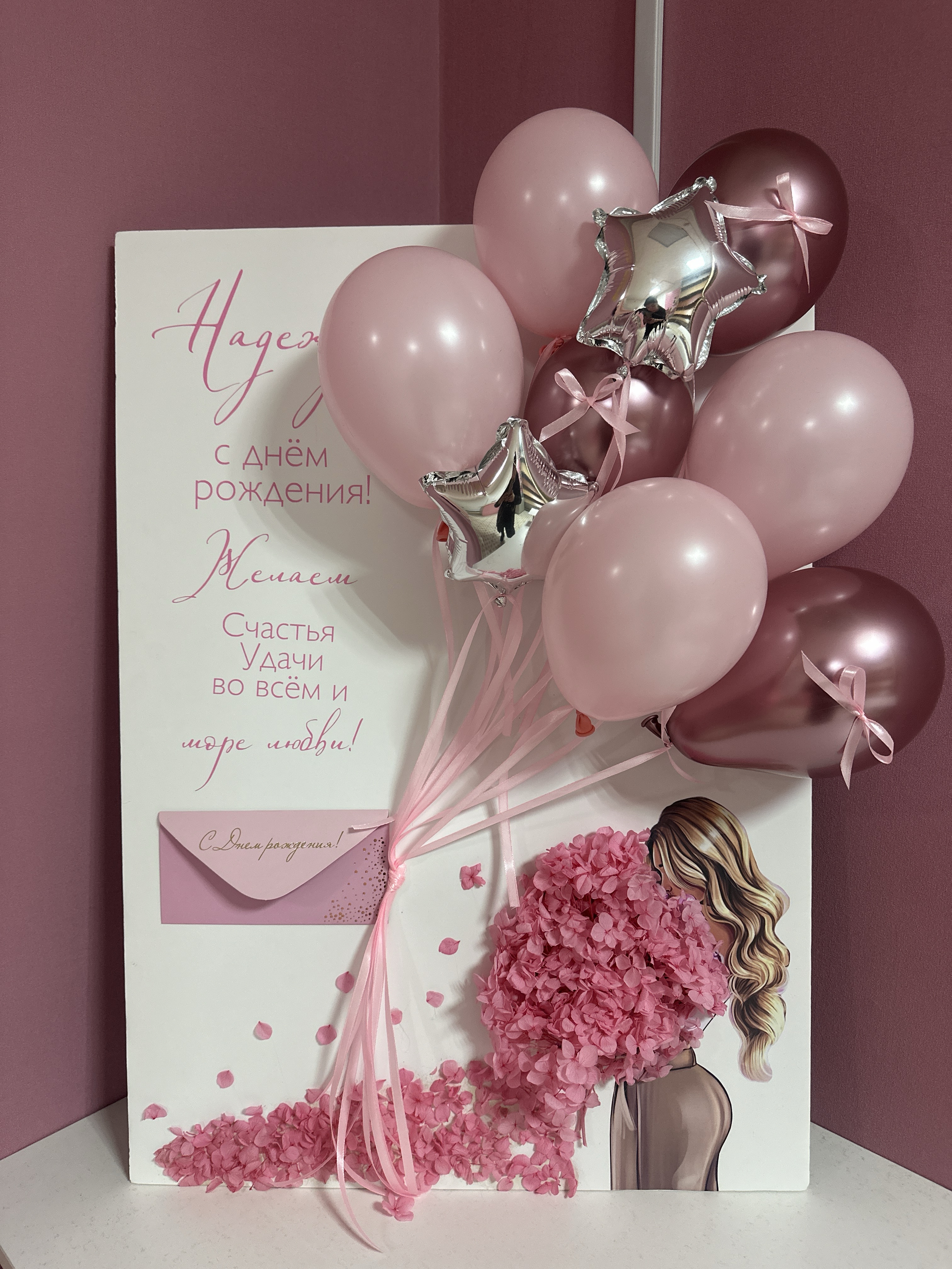 Объемная открытка с декором из стабилизированных цветов и надписью ,...