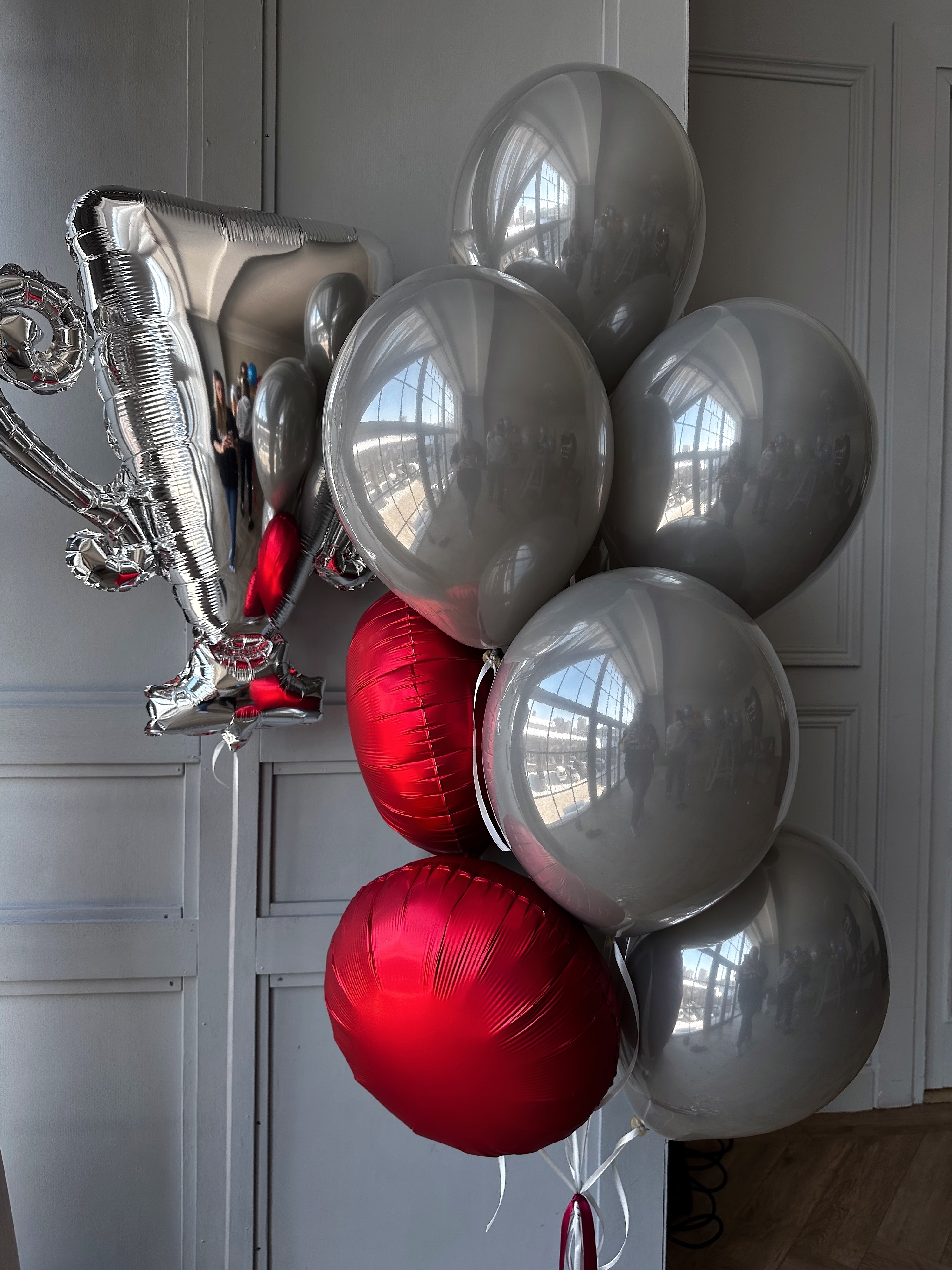 • Фонтан из 10 шаров, в котором 8 серых шаров в технике дабл стафф и 2 красных круга.