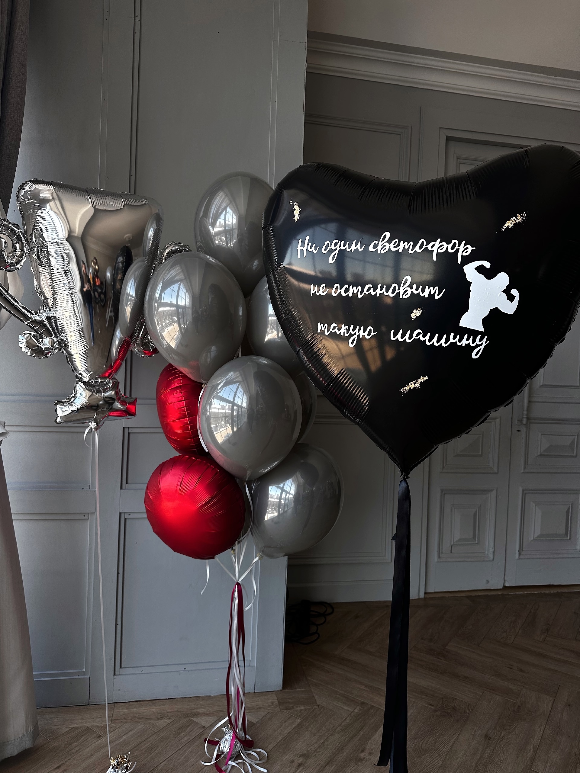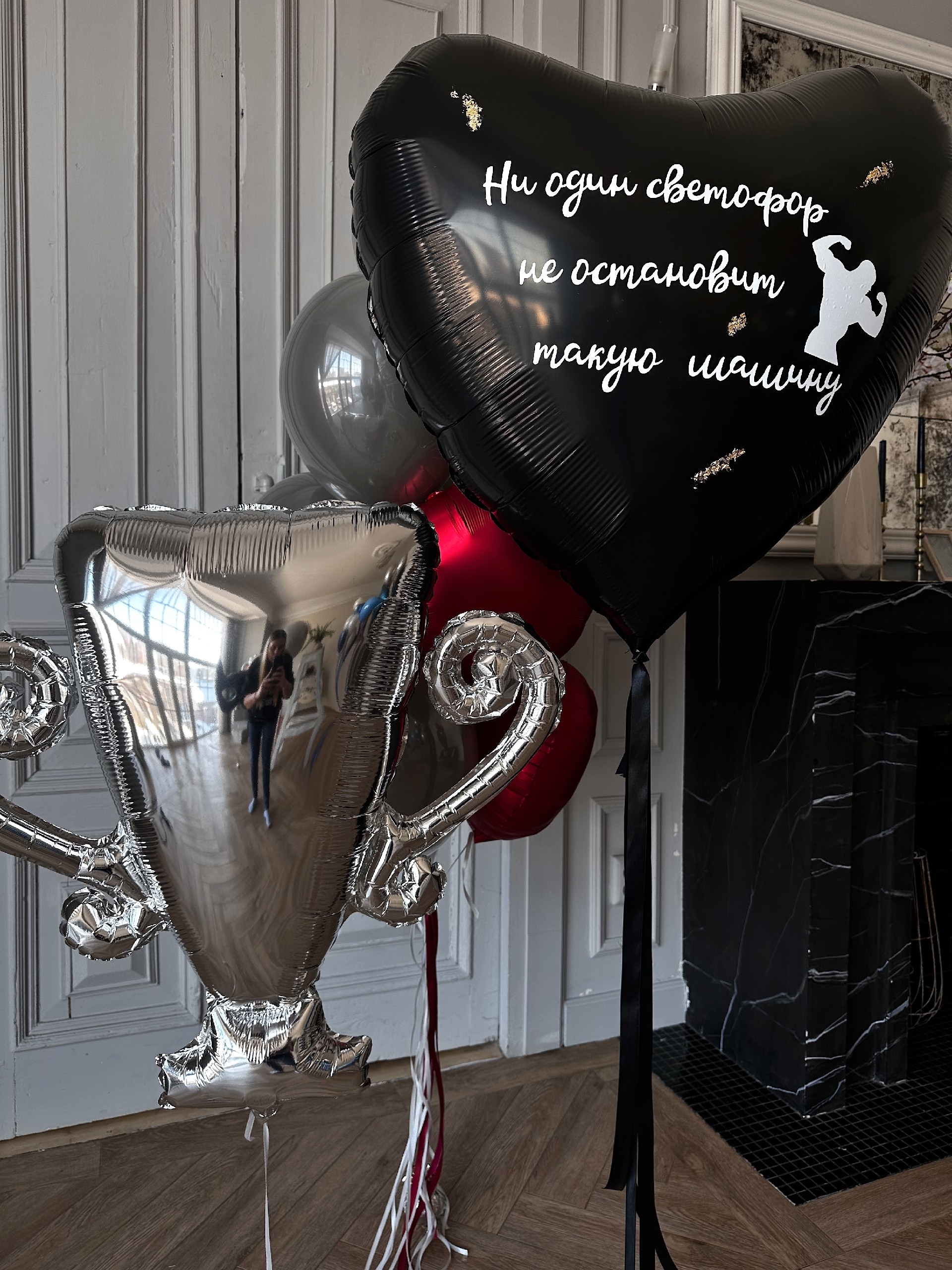 • Фонтан из 10 шаров, в котором 8 серых шаров в технике дабл стафф и 2 красных круга.
