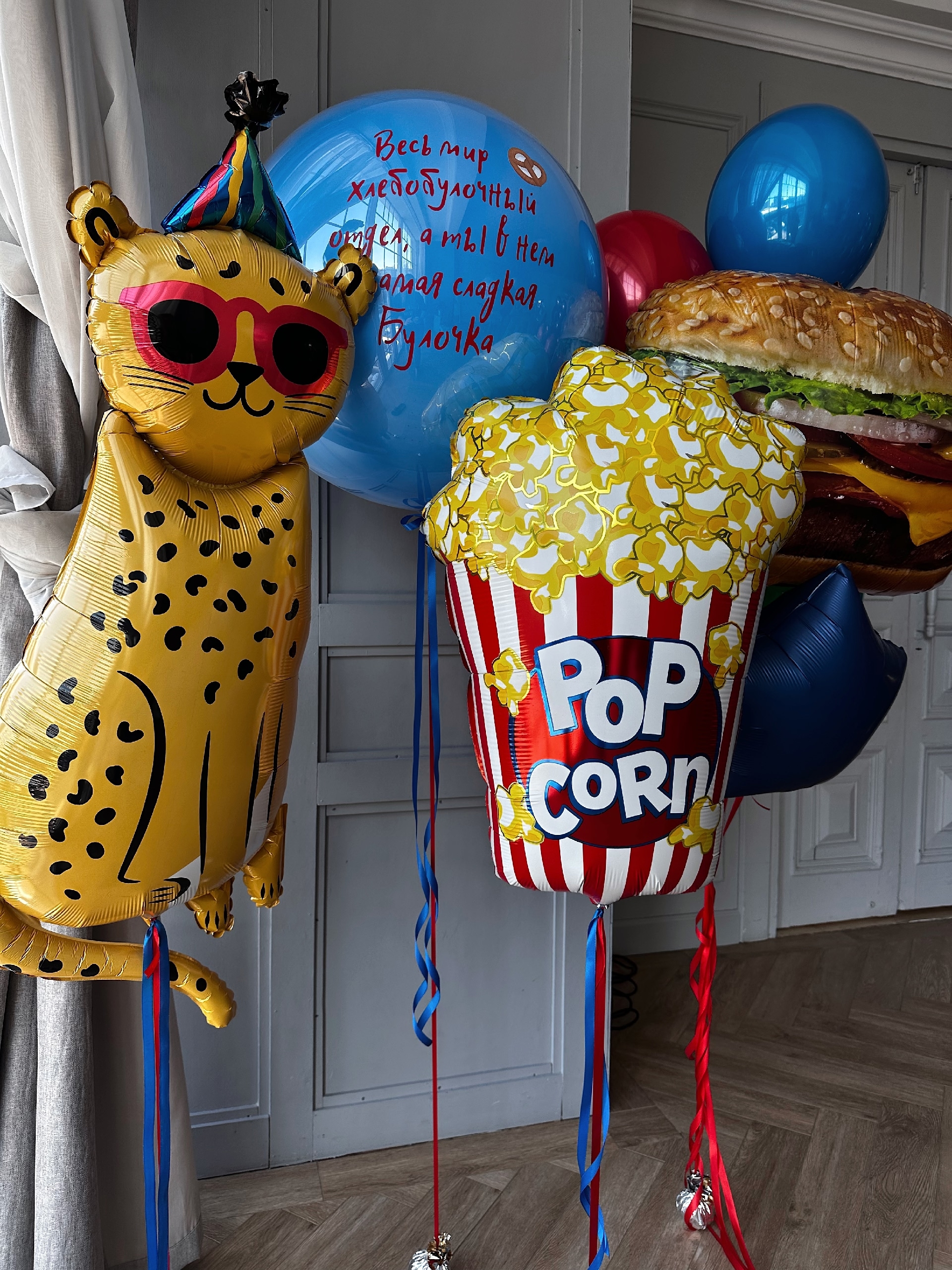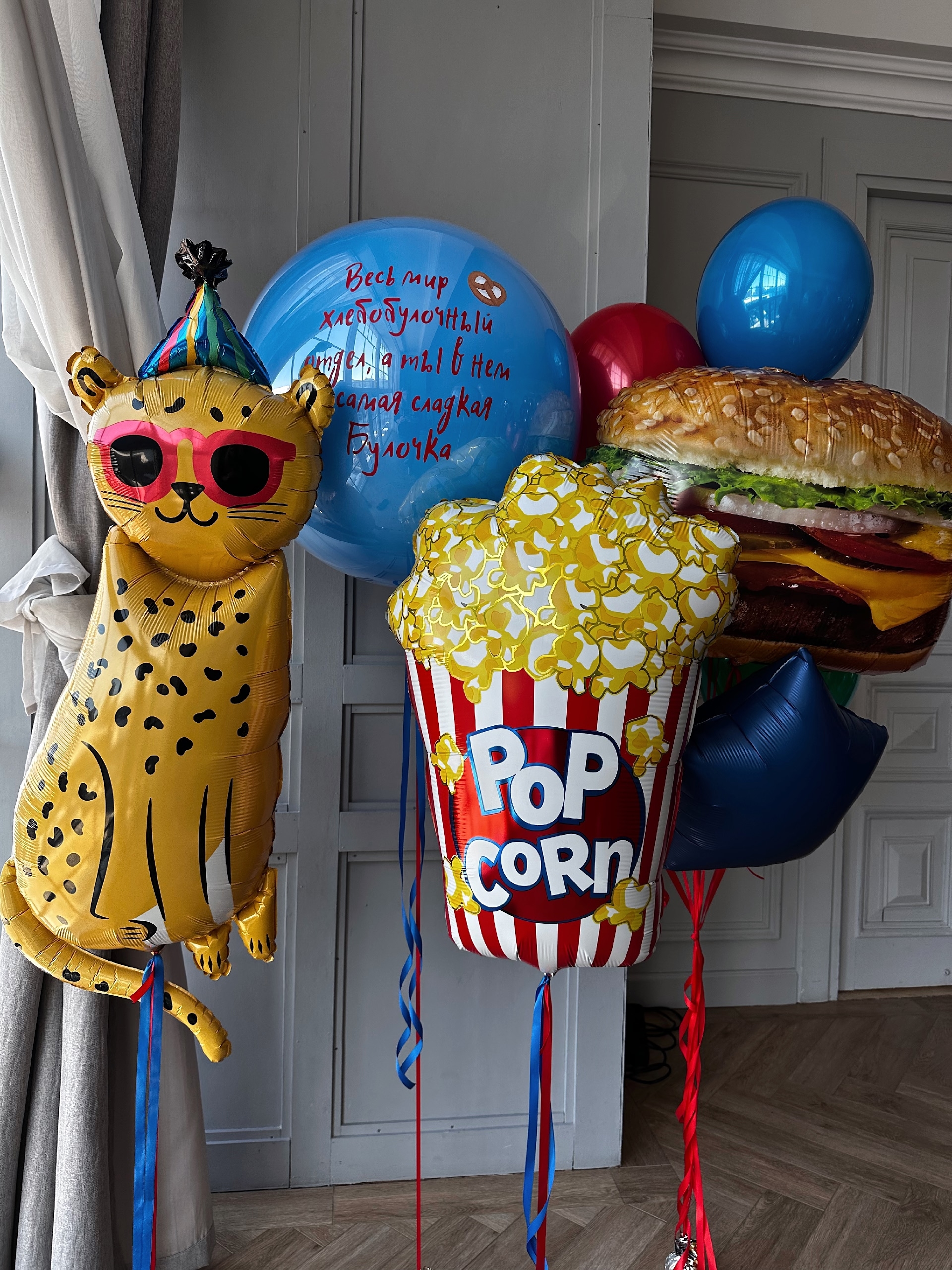 • фонтан, в котором 2 шара синих в технике дабл стафф, 2 шара зелёных в технике дабл стафф, 2 шара красных в технике дабл стафф, 1 звёздочка, 1 чизбургер.