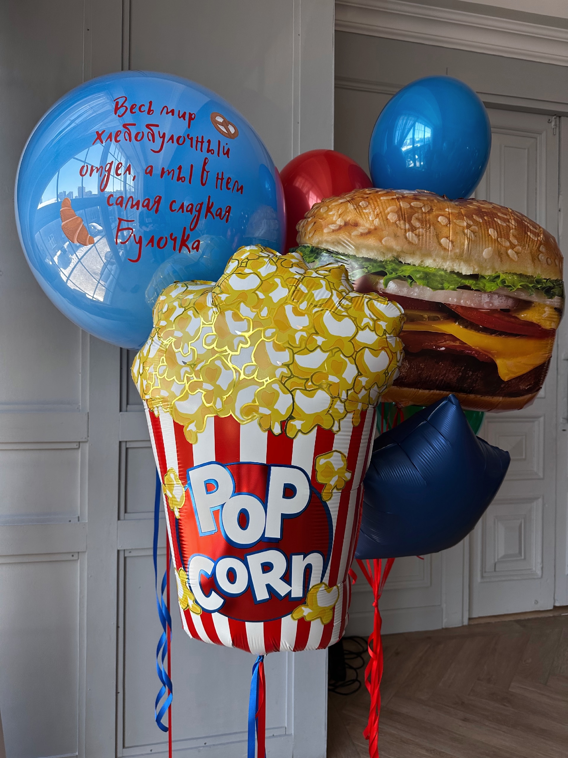 • фонтан, в котором 2 шара синих в технике дабл стафф, 2 шара зелёных в технике дабл стафф, 2 шара красных в технике дабл стафф, 1 звёздочка, 1 чизбургер.
