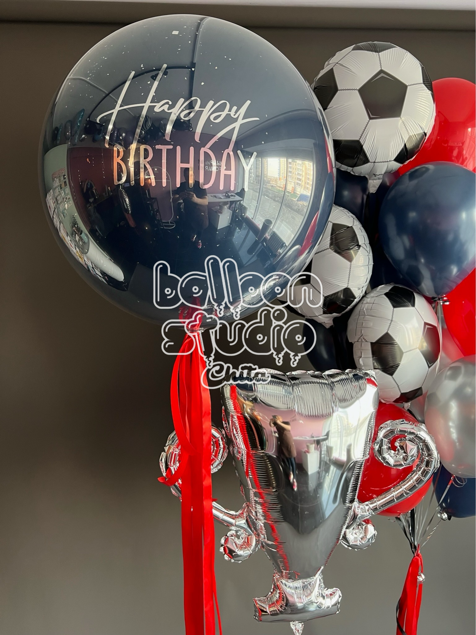 Состав набор шаров с гелием: Латексный "стеклянный" шар с гелием и индивидуальной надписью Темно-синий 60 см - 1 шт Фольгированный шар с гелием "Футбольный мяч" - 3 шт Латексные шары с гелием пастель(темно-синий, красный. серебро) - 10 шт грузики Данный набор шаров с гелием состоит из 16 шаров