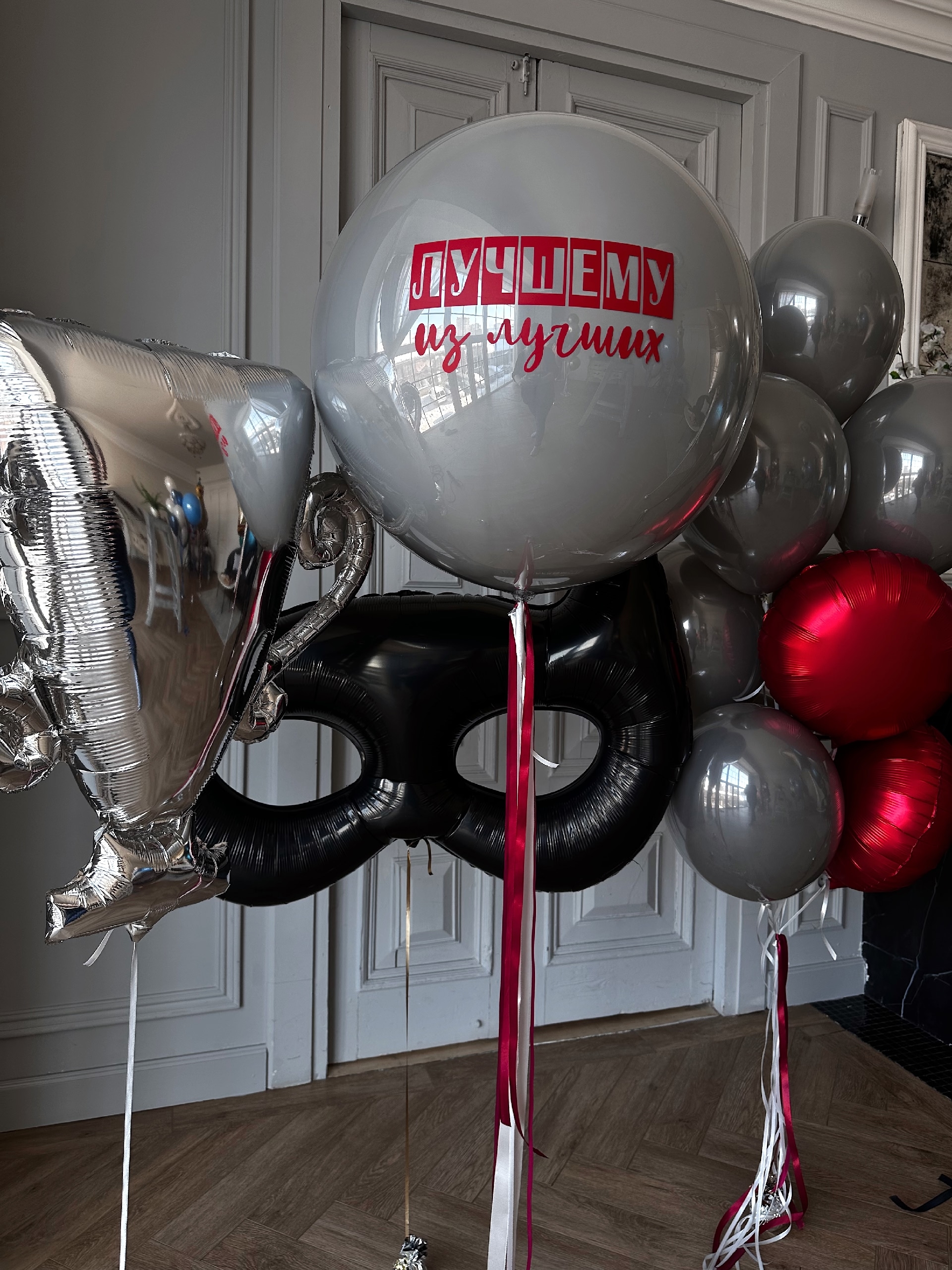 Фонтан из 10 шаров, в котором 8 серых шаров в технике дабл стафф и 2 красных круга.