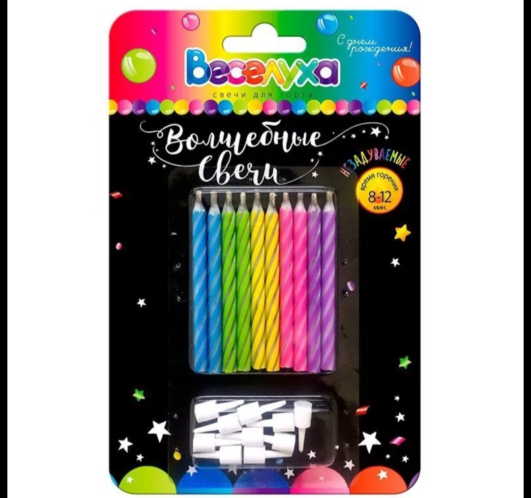 Свечи тортовые "Волшебные незадуваемые" Разноцветный неон (Ассорти) с держателями